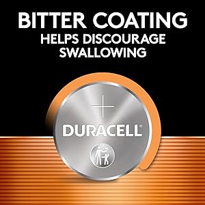 - BITTER TASTE ON BOTH SIDES: Duracell Lithium Coin CR2032 3 Volt batteries have a non-toxic, bitter coating applied on both sides, to help discourage swallowing.